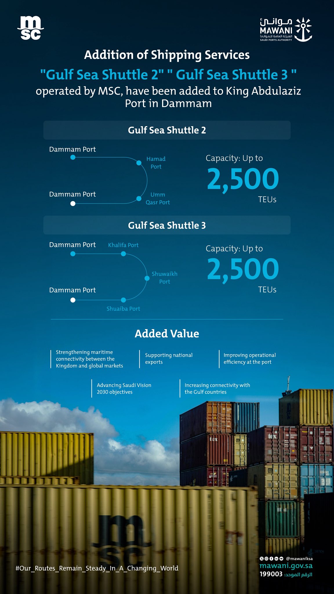 “The new services connect Saudi ports to 17 regional and international destinations, including Qingdao, Shanghai, Ningbo, Nansha and Shekou in China, Singapore, Sokhna in Egypt, Aqaba in Jordan, Nhava Sheva and Mundra in India, Djibouti, Berbera in Somaliland, Hamad Port, Umm Qasr Port, Khalifa Port in Bahrain, Shuwaikh Port and Shuaiba Port,” Mawani said.